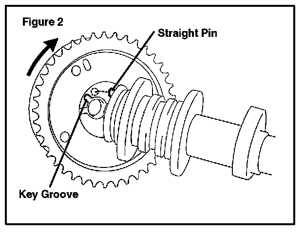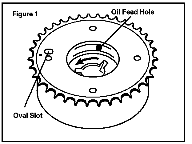A. The camshaft timing gear should come in the unlocked position from the factory. If it is difficult to install the camshaft timing gear, the lock pin may be engaged. To disengage the lock pin, apply and hold approximately 20 psi of air pressure at the oil feed hole located 90 degrees clockwise of the oval slot. (See Figure 1.) Once the pin has released, turn the interior assembly counterclockwise. (See black arrow in Figure 1.)