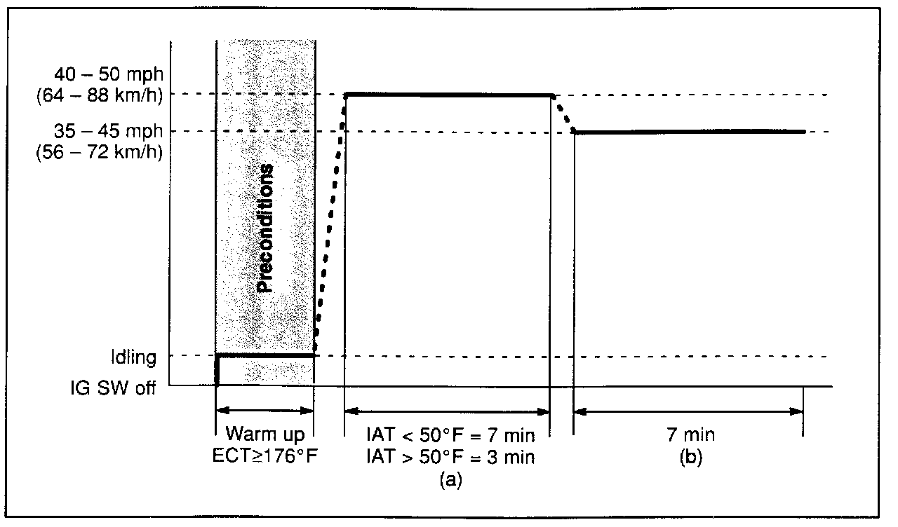 ^ If IAT (Intake Air) was less than 50°F (10°C) when the engine was started, drive for 7 minutes.