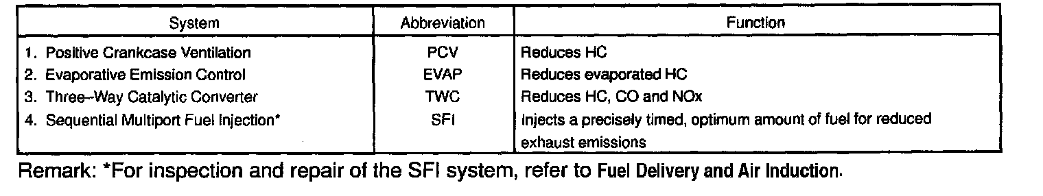 PURPOSEThe emission control Systems are installed to reduce the amount of CO, HC and NOx exhausted from the engine (3 and 4), to prevent the atmospheric release of blow-by gas-containing HC (1) and evaporated fuel containing HC being released from the fuel tank (2).