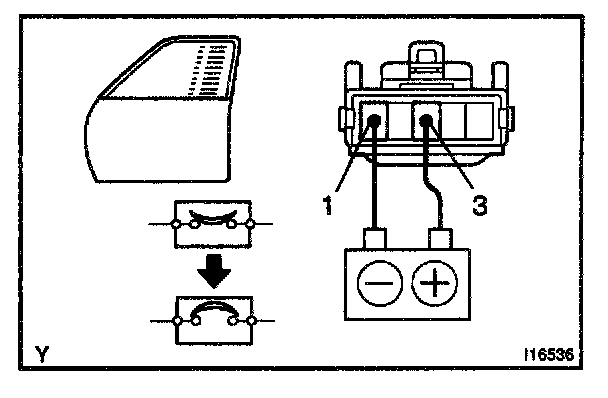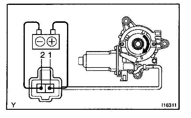 b. Connect the positive (+) lead from the battery to terminal 3 and the negative (-) lead to terminal 1 on the wire harness side connector, and raise the window to fully closed position.
