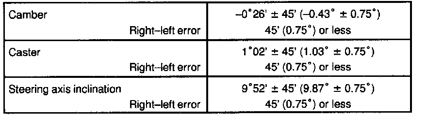 If the caster and steering axis inclination are not within the specified values, after the camber has been correctly adjusted, recheck the suspension parts for damaged and/or worn out parts.