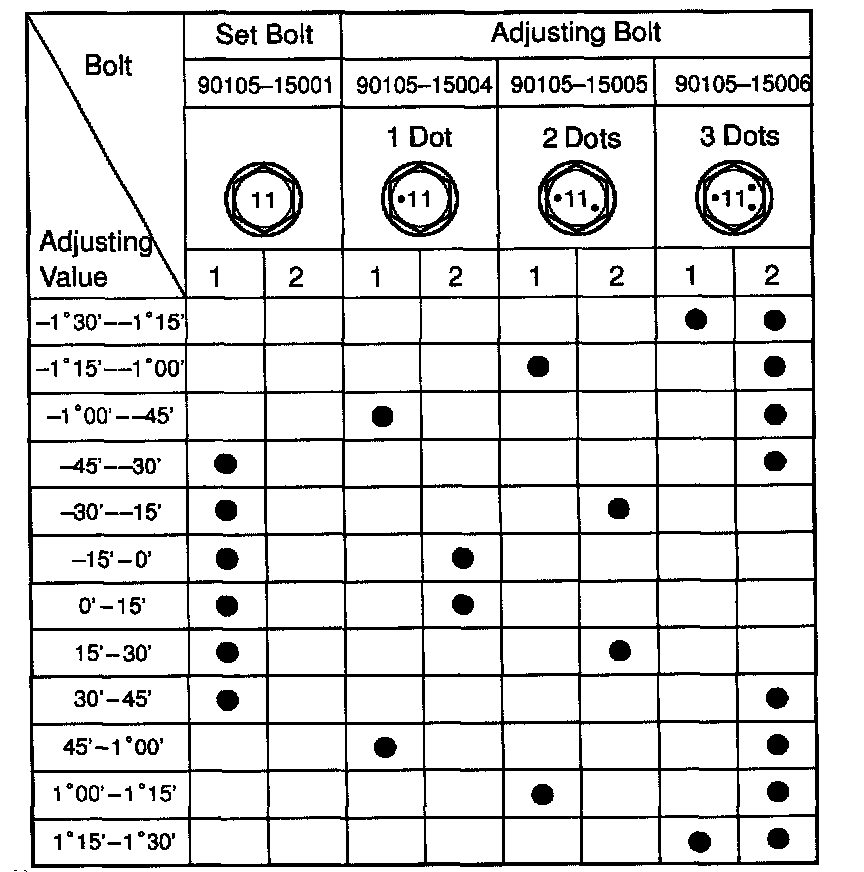 If the camber is not within the specified value, using the following table, estimate how much additional camber adjustment will be required, and select the camber adjusting bolt.