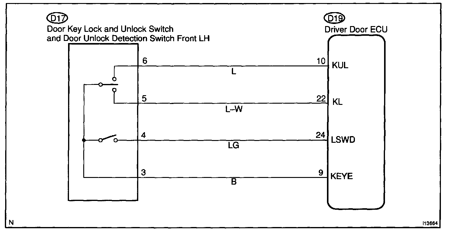 The door key lock and unlock switch is built in the door key cylinder. When the key is turned to the lock side, terminal 3 of the switch is grounded and when the key is turned to the unlock side, terminal 2 of the switch is grounded.