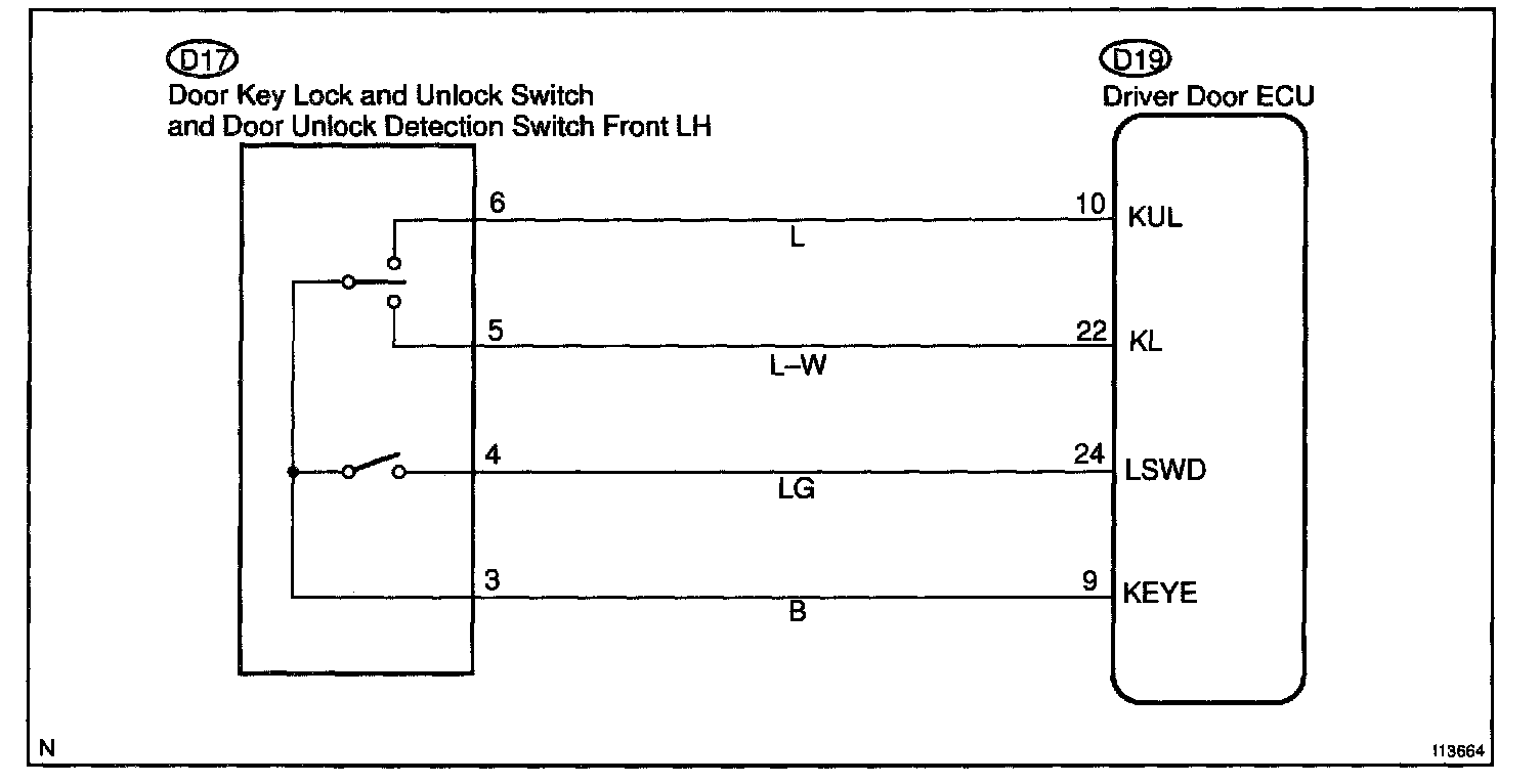 CIRCUIT DESCRIPTIONThe door unlock detection switch is built in the door lock motor assembly. This switch is ON when the door lock knob is in the unlock position and OFF when the lock knob is in the lock position. The ECU detects the door lock knob conditions is this circuit. It is used as one of the operating conditions for the key confinement prevention function.
