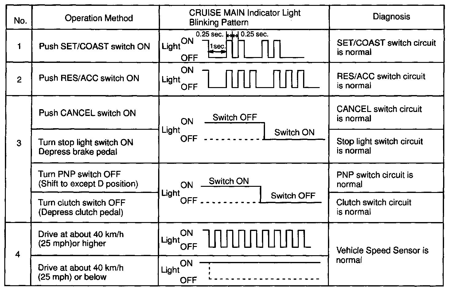 f. Read the blinking pattern of the CRUISE MAIN indicator light.