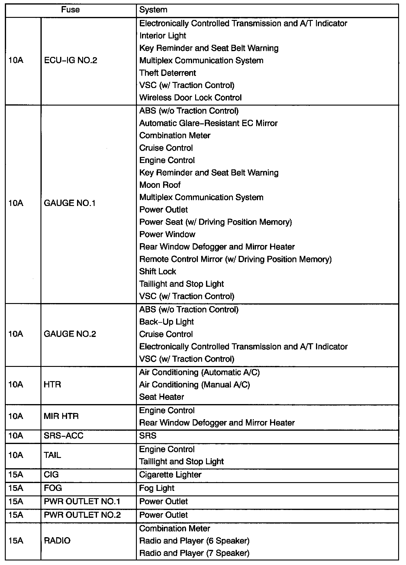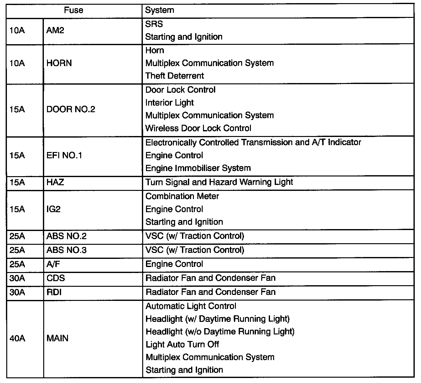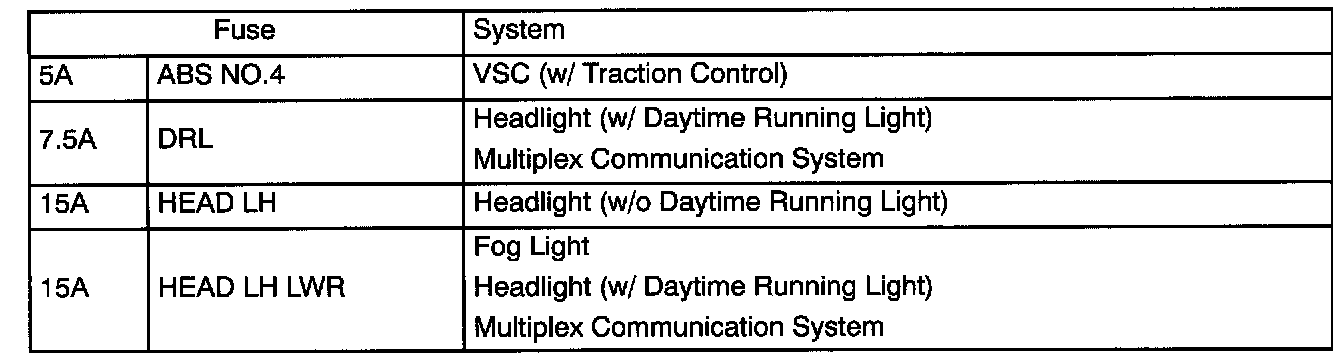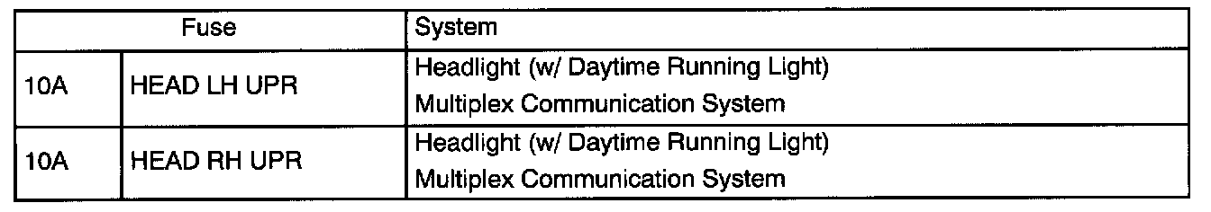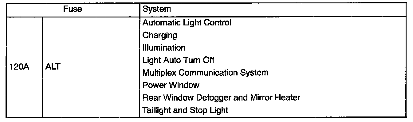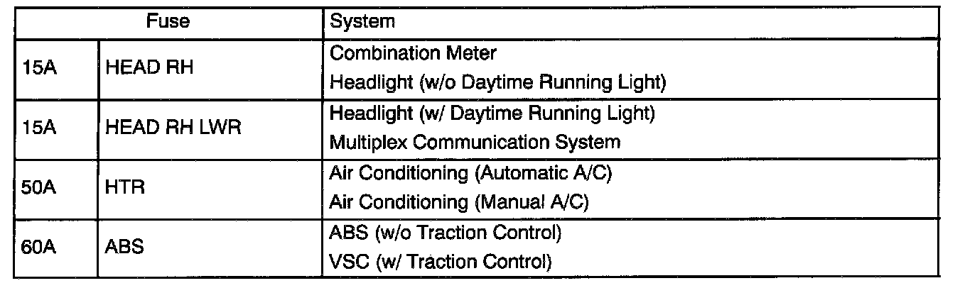 Engine Room R/B No.2 Fuse Applications: