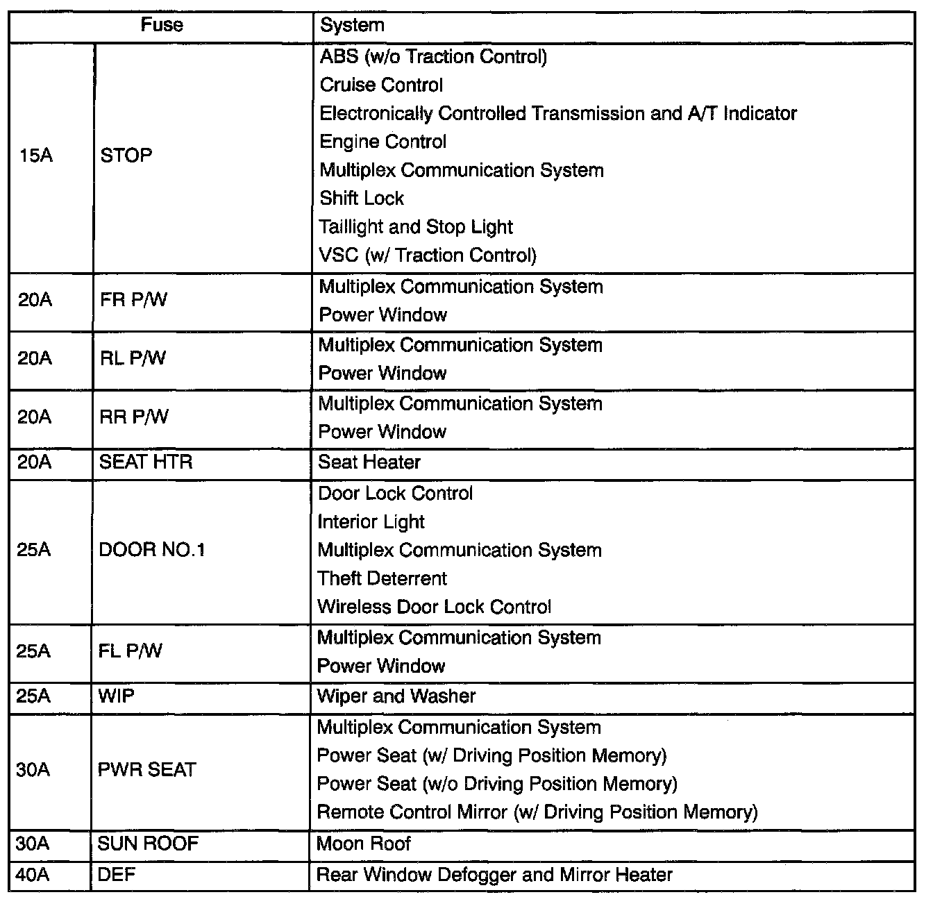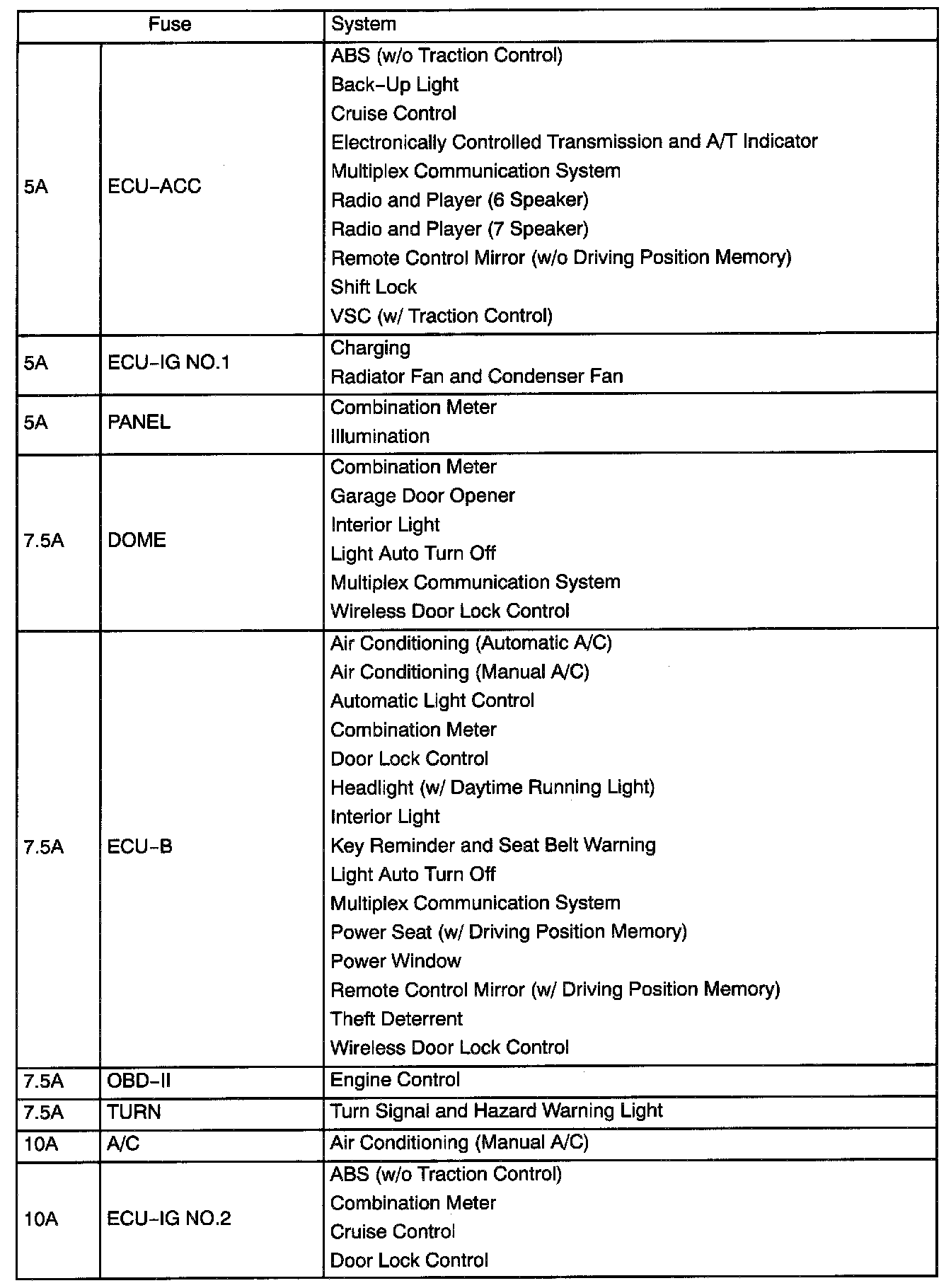 Interior Panel Fuse Identification