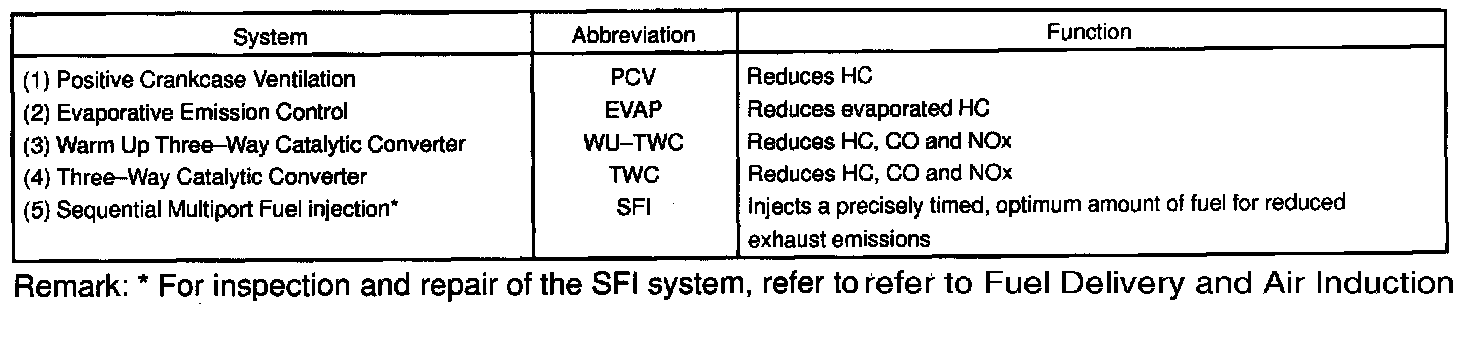 PURPOSEThe emission control Systems are installed to reduce the amount of CO, HC and NOx exhausted from the engine (3. 4. and 5.), to prevent the atmospheric release of blow-by gas-containing HC 1. and evaporated fuel containing HC being released from the fuel tank 2.