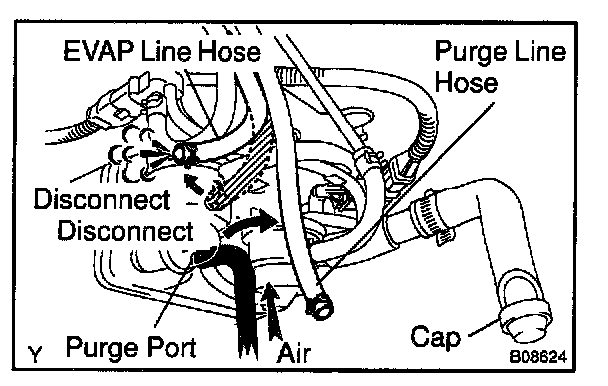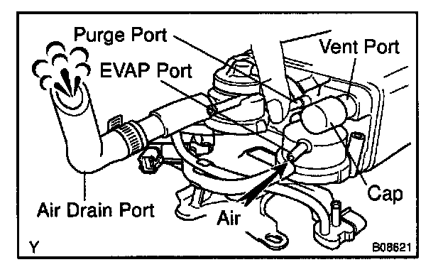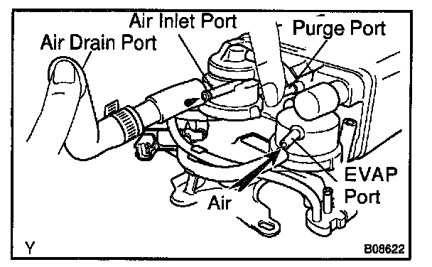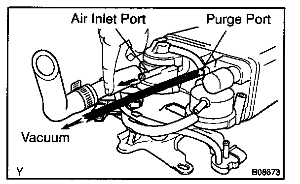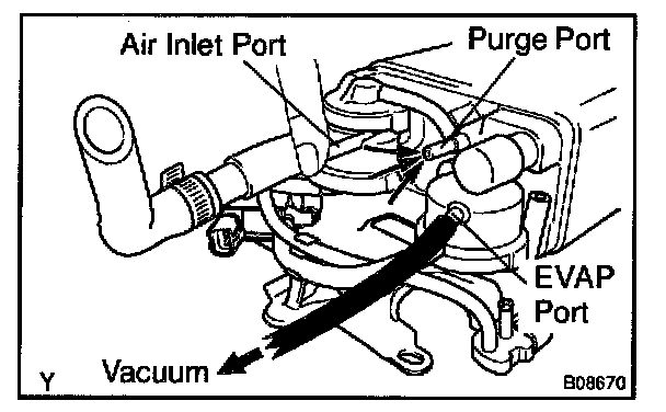5. While holding the air inlet port closed, apply vacuum (3.43 kpa, 25.7 mm Hg, 1.01 in.Hg) to the EVAP port and check that air flows into the purge port.