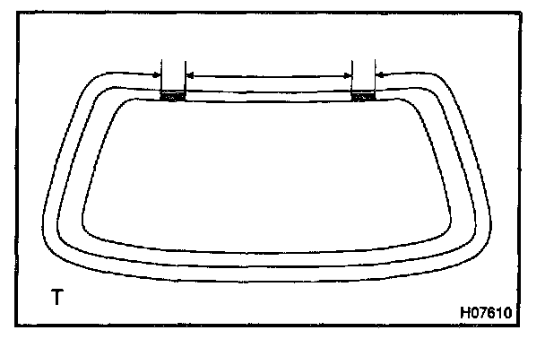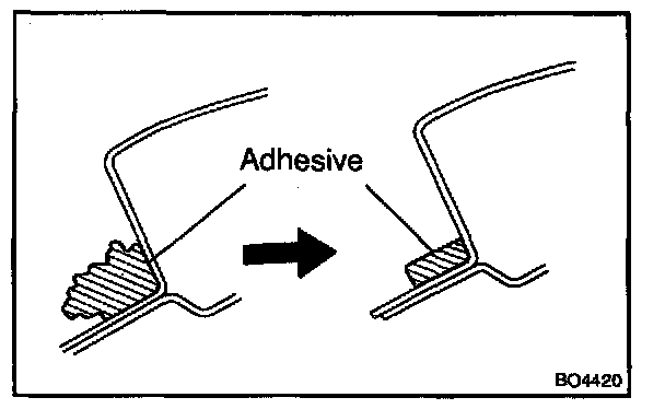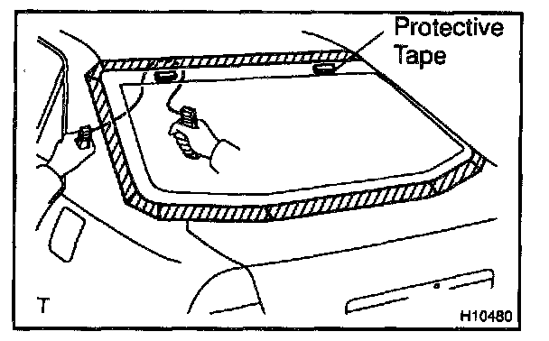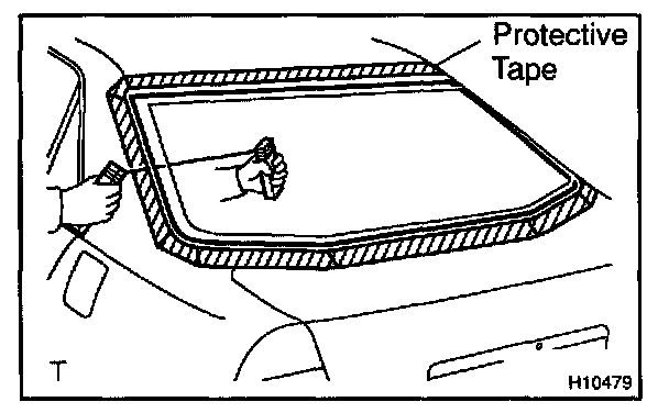 b. Hold the back window glass in place securely with a protective tape or equivalent until the adhesive hardens.