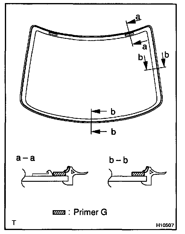 a. Using a brush or sponge, coat the edge of the glass and the contact surface with Primer G as shown in the illustration.