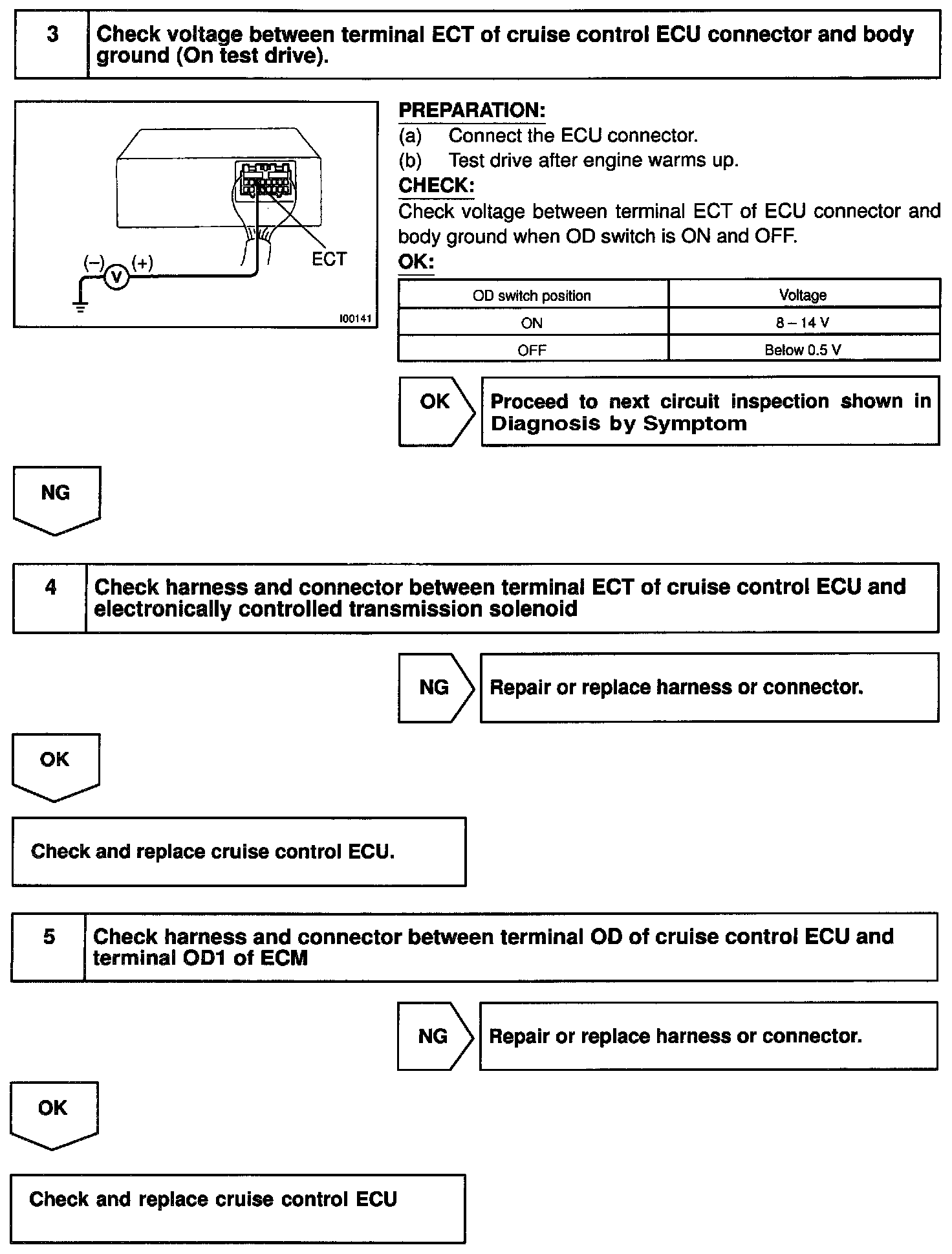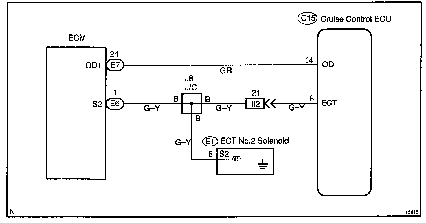 Terminal ECT of the cruise control ECU detects the shift change signal (output to electronically controlled transmission No.2 solenoid) from the ECM.