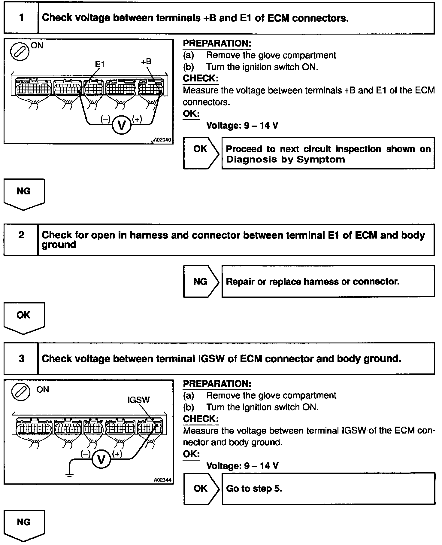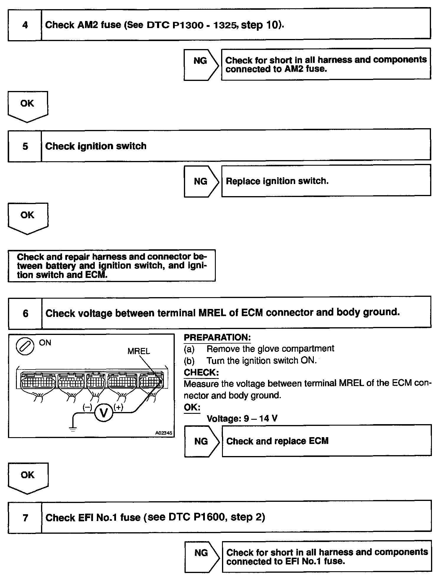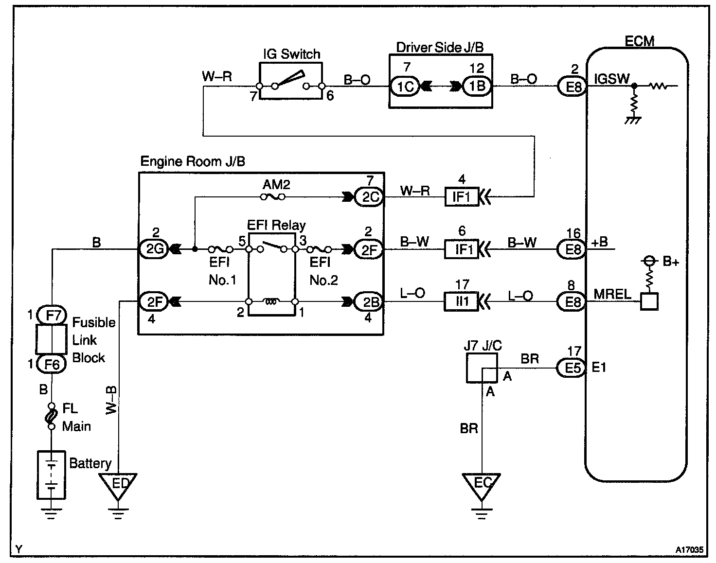 This signal causes current to flow to the coil, closing the contacts of the EFI main relay and supplying power to terminal +B of the ECM.
