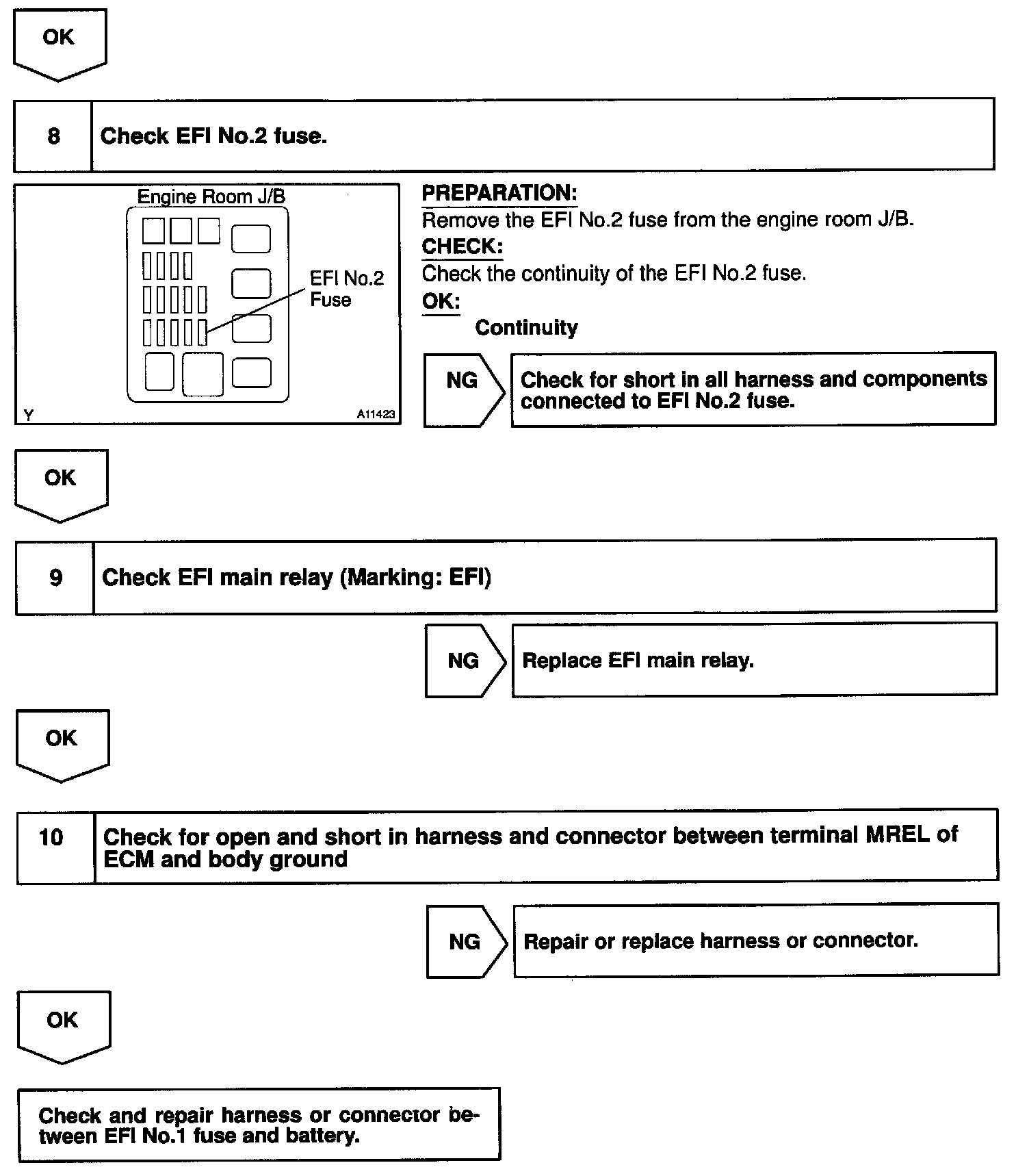 CIRCUIT DESCRIPTIONWhen the ignition switch is turned ON, battery positive voltage is applied to terminal IGSW of the ECM and the EFI main relay (Marking: EFI) control circuit in the ECM sends a signal to terminal MREL of the ECM switching on the EFI main relay.