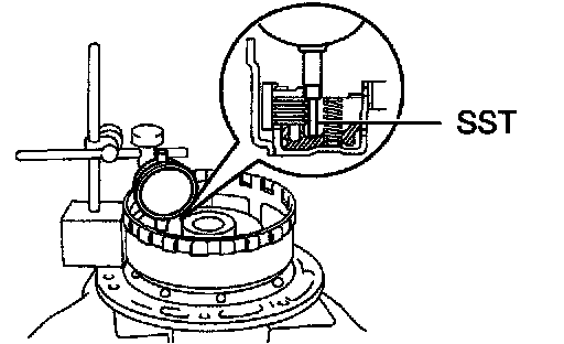 b. Install a dial indicator and measuring terminal Special Service Tool (SST) together, measure the direct clutch piston stroke while applying and releasing compressed air (392 - 785 kPa, 4 - 8 kgf/cm2, 57 - 114 psi).
