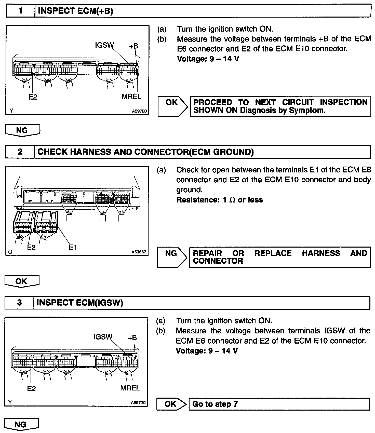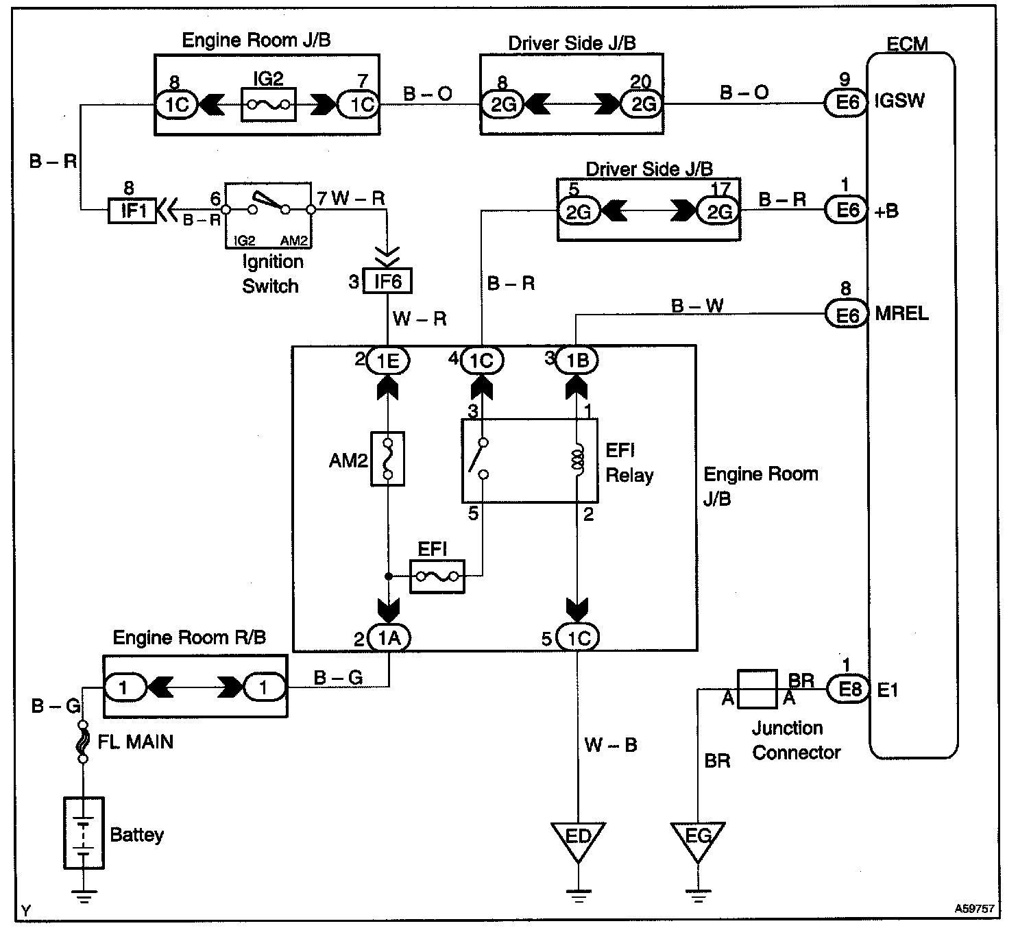 CIRCUIT DESCRIPTIONWhen the ignition switch is turned on, battery positive voltage is applied to 1G2 Relay, terminal IGSW of the ECM and the EFI main relay control circuit in the ECM sends a signal to terminal MREL of the ECM by switching on the EFI main relay.