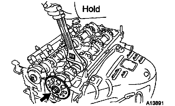 a. Hold the hexagonal head wrench portion of the camshaft with a wrench, and loosen the sprocket bolts.