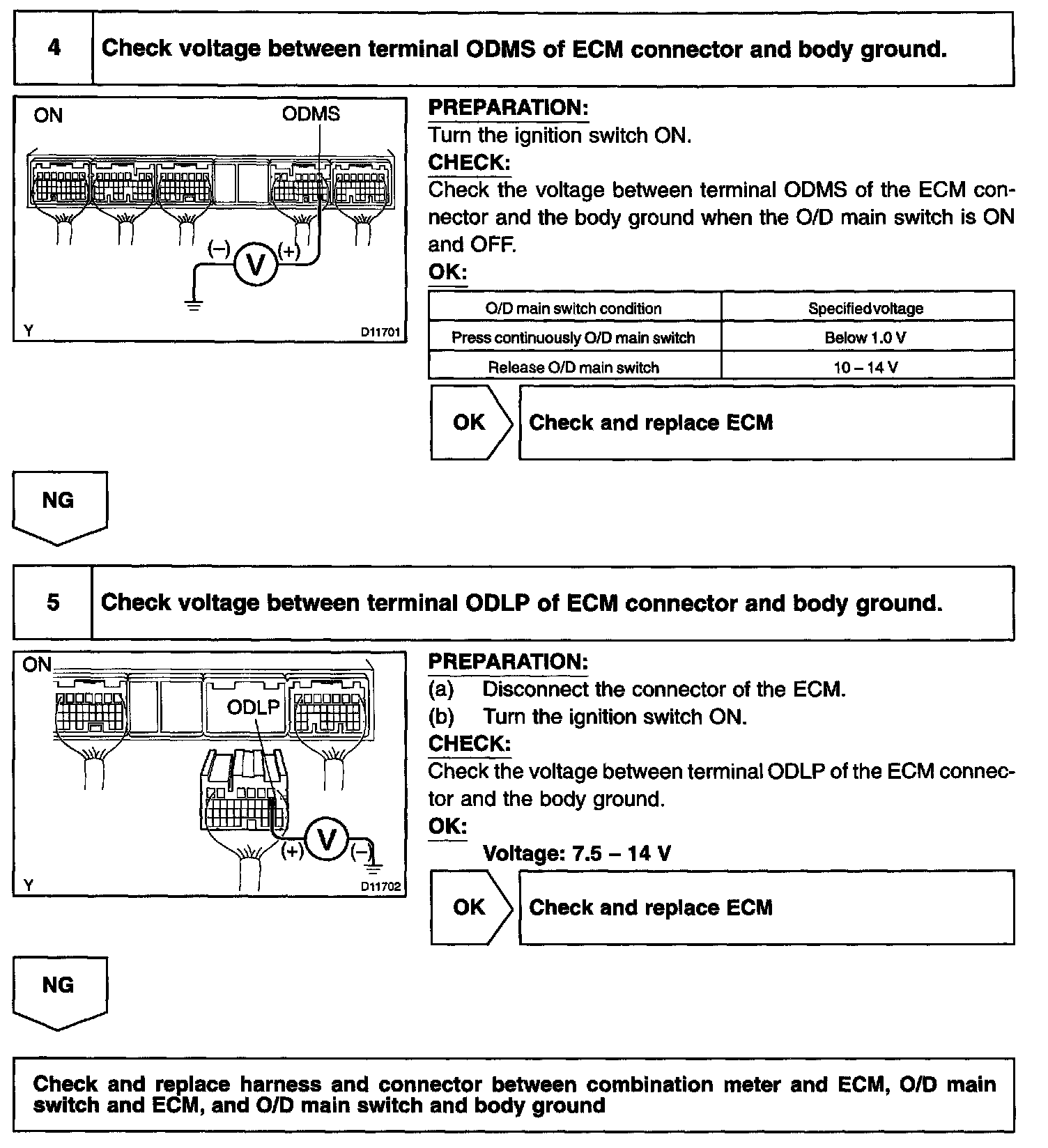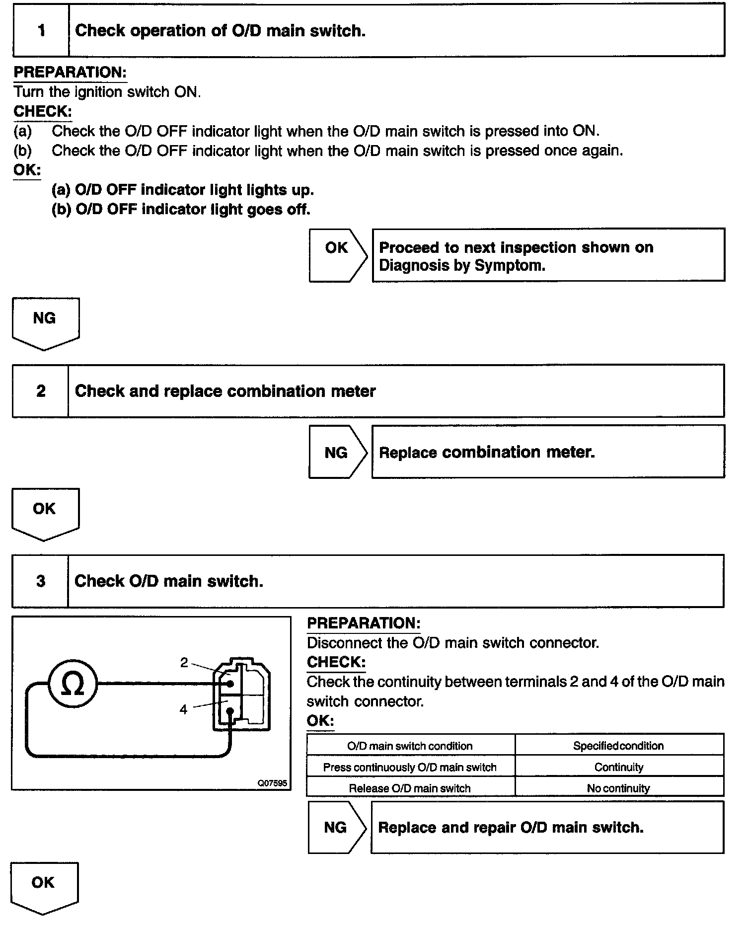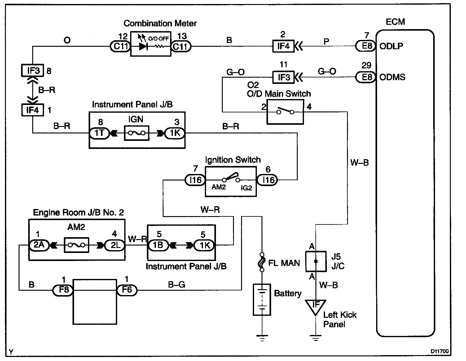 CIRCUIT DESCRIPTIONThe O/D main switch is a momentary type switch. When pressing the O/D main switch, the O/D OFF indicator light lights up and the ECM prohibits shifting into O/D, and when pressing it once again, the O/D OFF indicator light goes off and the ECM allows shifting into O/D. Turning the IG switch OFF will reset the O/D OFF indicator light.