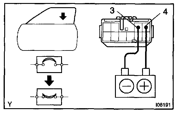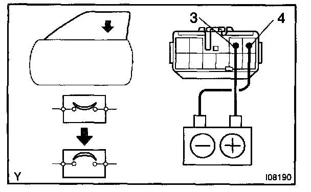 b. Connect the positive (+) lead from the battery to terminal 3 and the negative (-) lead to terminal 4 on the wire harness side connector and raise the window to full closed position.
