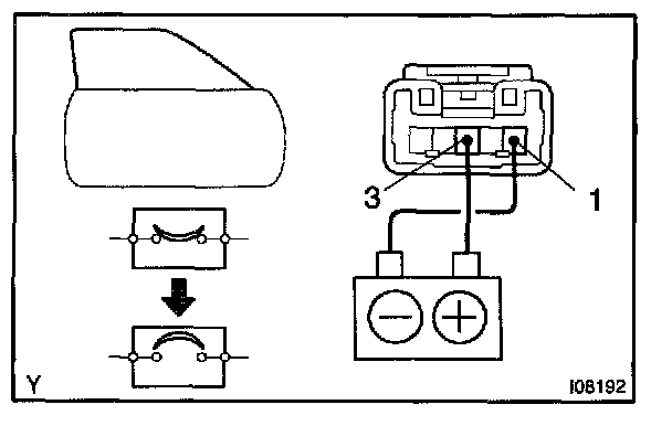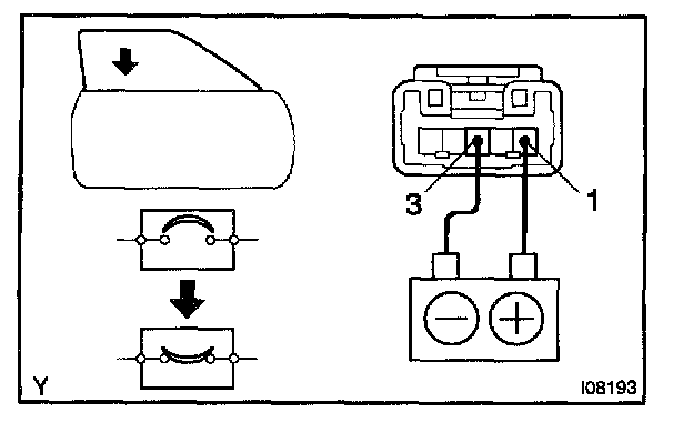 b. Connect the positive (+) lead from the battery to terminal 3 and the negative (-) lead to terminal 1 on the wire harness side connector, and raise the window to full closed position.