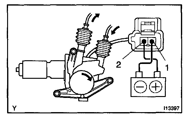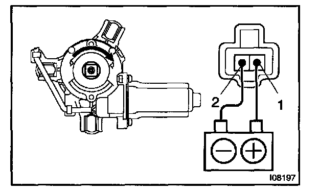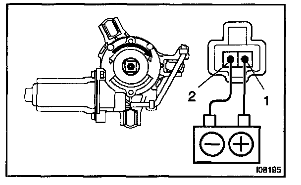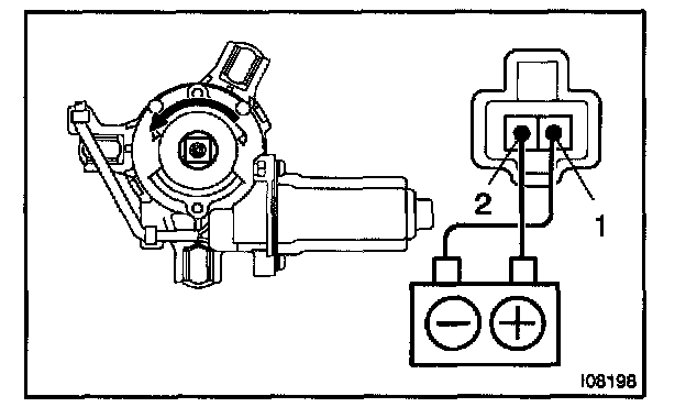 a. Connect the positive (+) lead from the battery to terminal 2 and the negative (-) lead to terminal 1, and check that the motor turns window up direction.