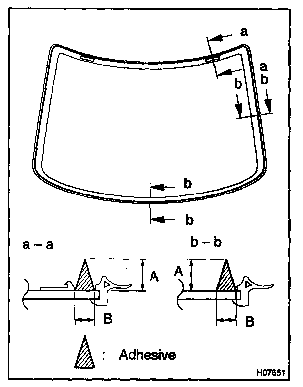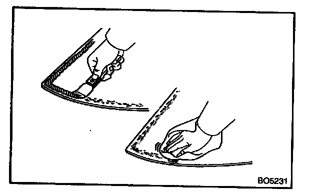 a. Using a brush or sponge, coat the edge of the glass and the contact surface with Primer G as shown in the illustration.