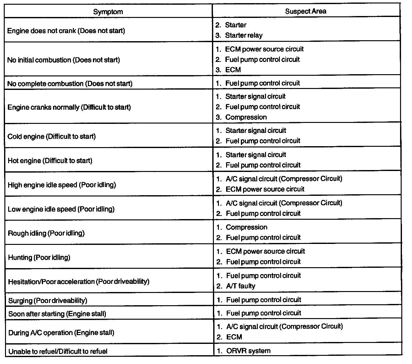 Problem Symptoms Table: