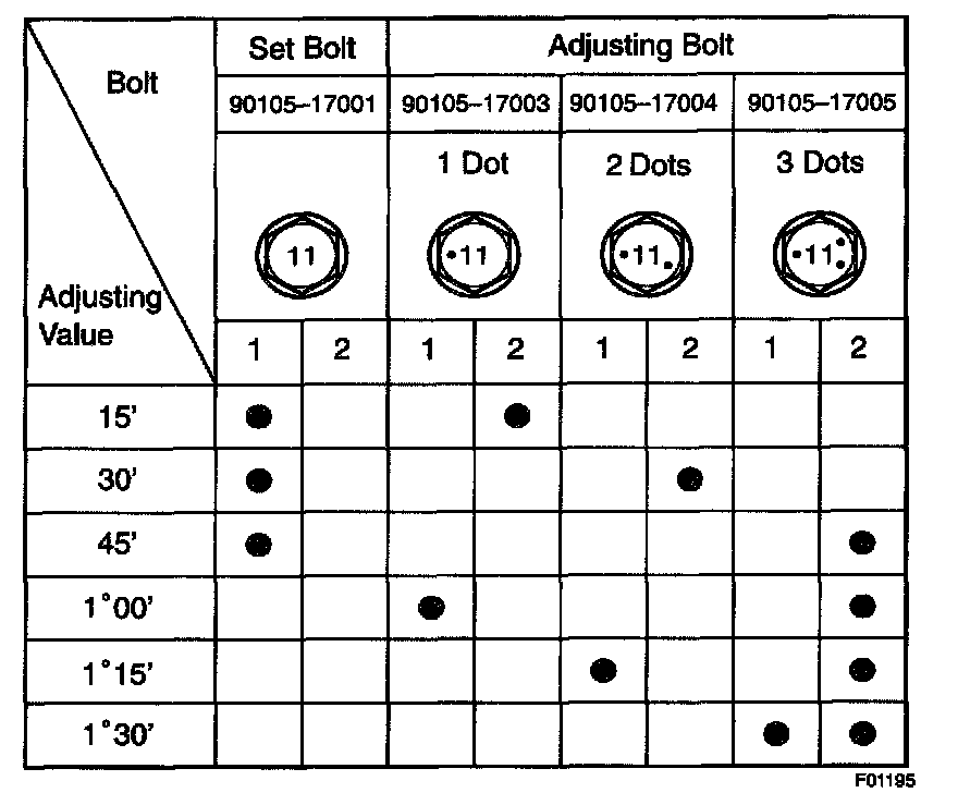 - Adjusting value for the set bolts is 6' - 30' (0.1° - 0.5°).