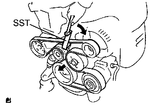 a) Slowly turn the belt tensioner clockwise for more than 3 seconds, and remove the drive belt by using SST.