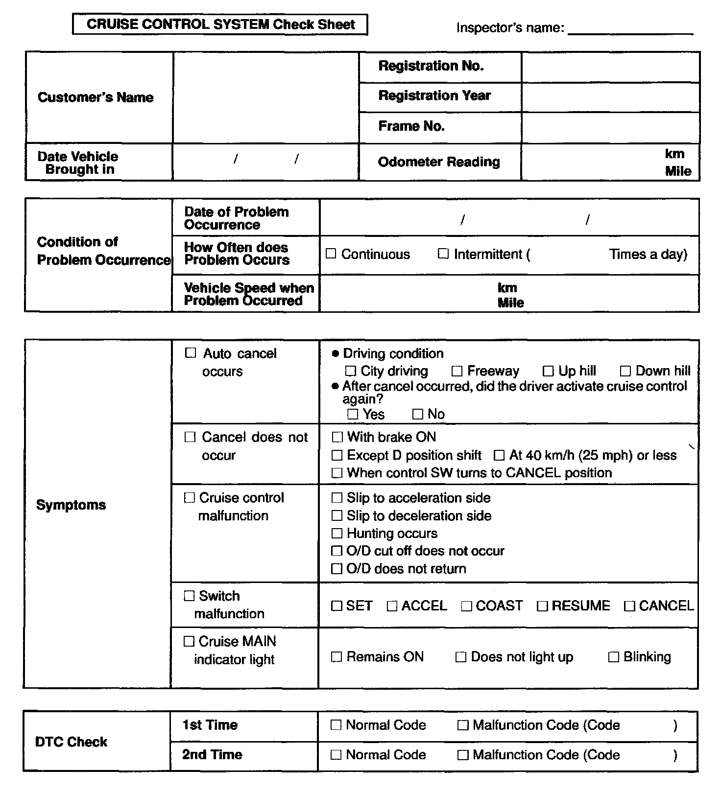 Cruise Control System Check Sheet: