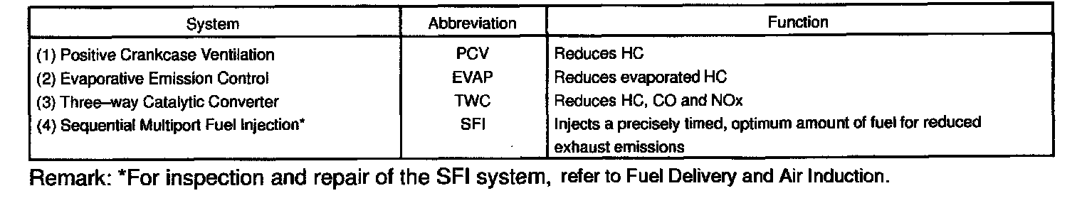 PURPOSEThe emission control Systems are installed to reduce the amount of CO, HC and NOx exhausted from the engine ((3) and (4)), to prevent the atmospheric release of blow-by gas-containing HC (1) and evaporated fuel containing HC being released from the fuel tank (2).