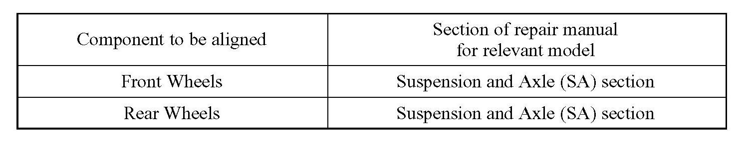 The drive train and chassis are components that can have great effects on the running performance and vibration resistance of the vehicle. After installing components in the sections listed in the table, perform alignments to ensure correct mounting angles and dimensions. Particularly accurate repair of the body must also be done to ensure correct alignment.