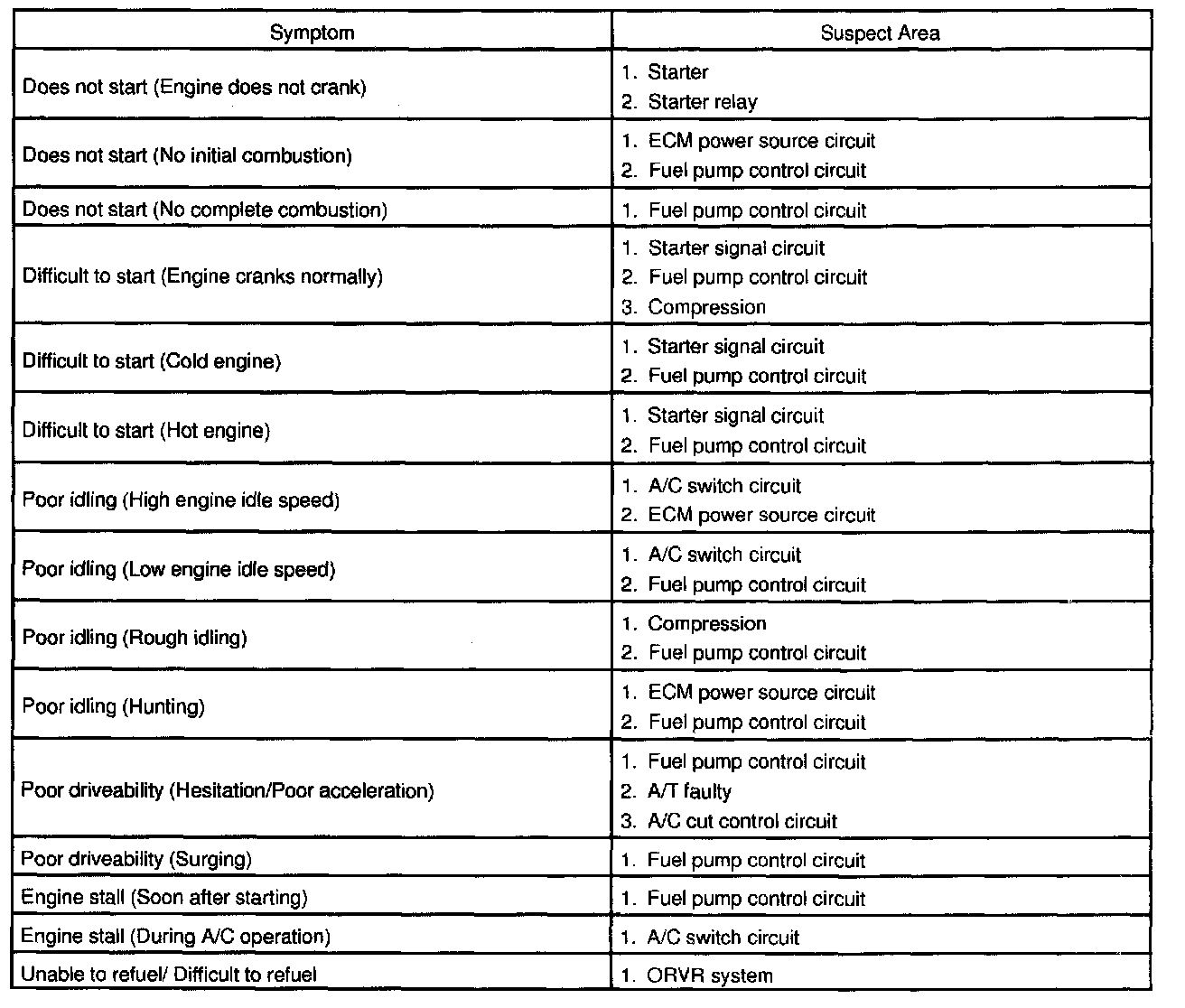 Problem Symptoms Table: