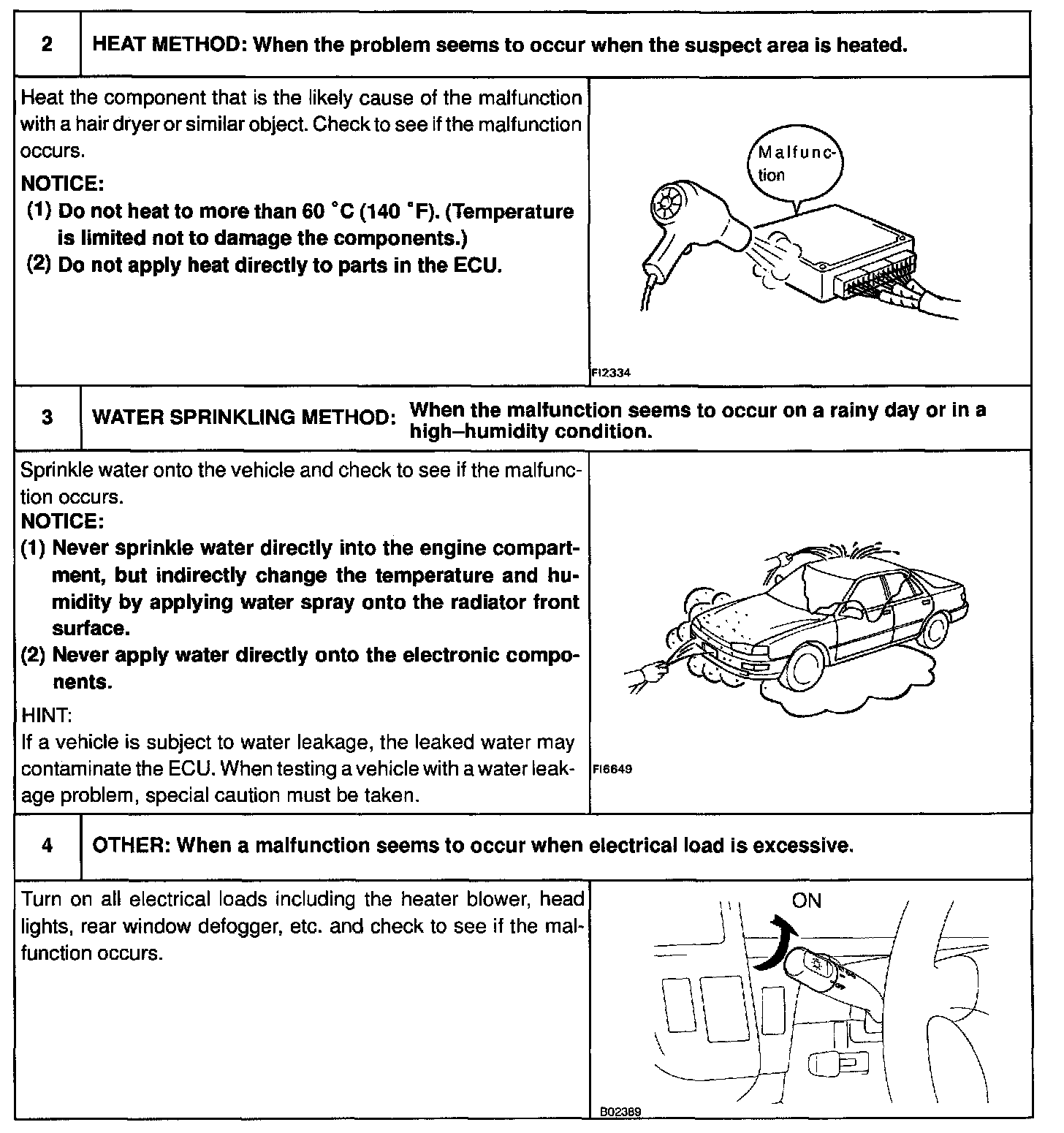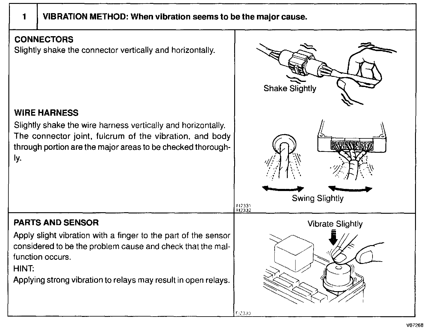 SYMPTOM SIMULATIONThe most difficult case in troubleshooting is when there are no problem symptoms occurring. In such cases, a thorough customer problem analysis must be carried out, then simulate the same or similar conditions and environment in which the problem occurred in the customer's vehicle. No matter how much experience a technician has, or how skilled he may be, if he proceeds to troubleshoot without confirming the problem symptoms he will tend to overlook something important in the repair operation and make a wrong guess somewhere, which will only lead to a standstill. For example, for a problem which only occurs when the engine is cold, or for a problem which occurs due to vibration caused by the road during driving, etc., the problem can never be determined so long as the symptoms are confirmed with the engine hot condition or the vehicle at a standstill. Since vibration, heat or water penetration (moisture) is likely cause for problem which is difficult to reproduce, the symptom simulation tests introduced here are effective measures in that the external causes are applied to the vehicle in a stopped condition.
