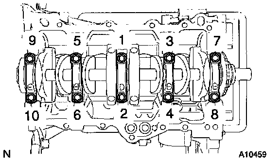 c. Install and uniformly tighten the 10 bolts of the bearing cap is several passes, in the sequence shown.