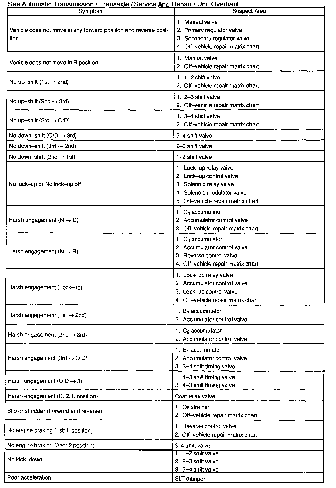 Chart 2: On-vehicle repair matrix chart
