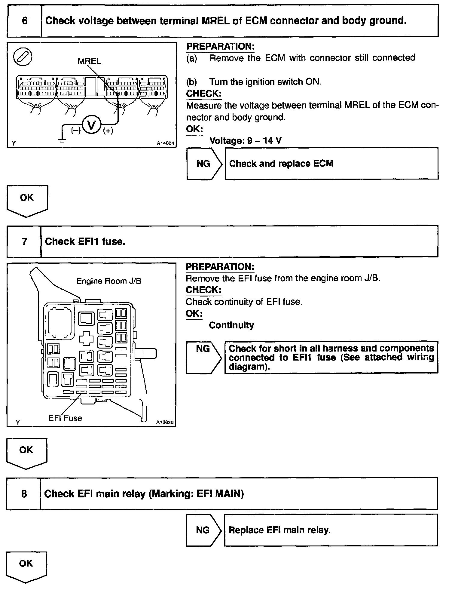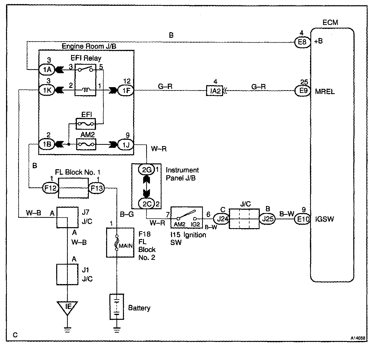 This signal causes current to flow to the coil, closing the contacts of the EFI main relay and supplying power to terminals +B of the ECM.
