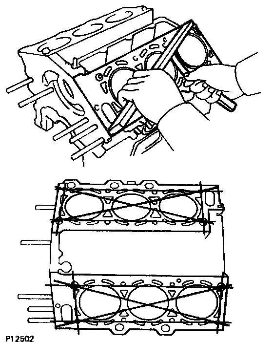 Using a precision straight edge and feeler gauge, measure the surface contacting the cylinder head gasket for warpage.
