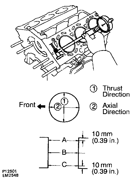 Using a cylinder gauge, measure the cylinder bore diameter at positions A, B and C in the thrust and axial directions.