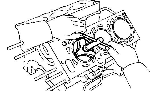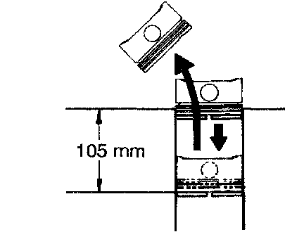 b. Using a piston, push the piston ring a little beyond the bottom of the ring travel, 105 mm (4.13 inch) from the top of the cylinder block.