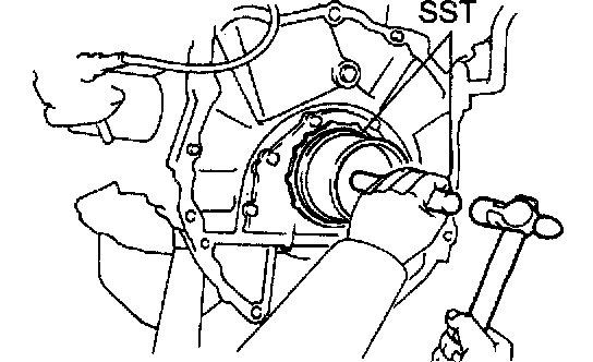 4. Using SST and a hammer, tap in the oil seal until its surface is flush with the rear oil seal retainer edge.