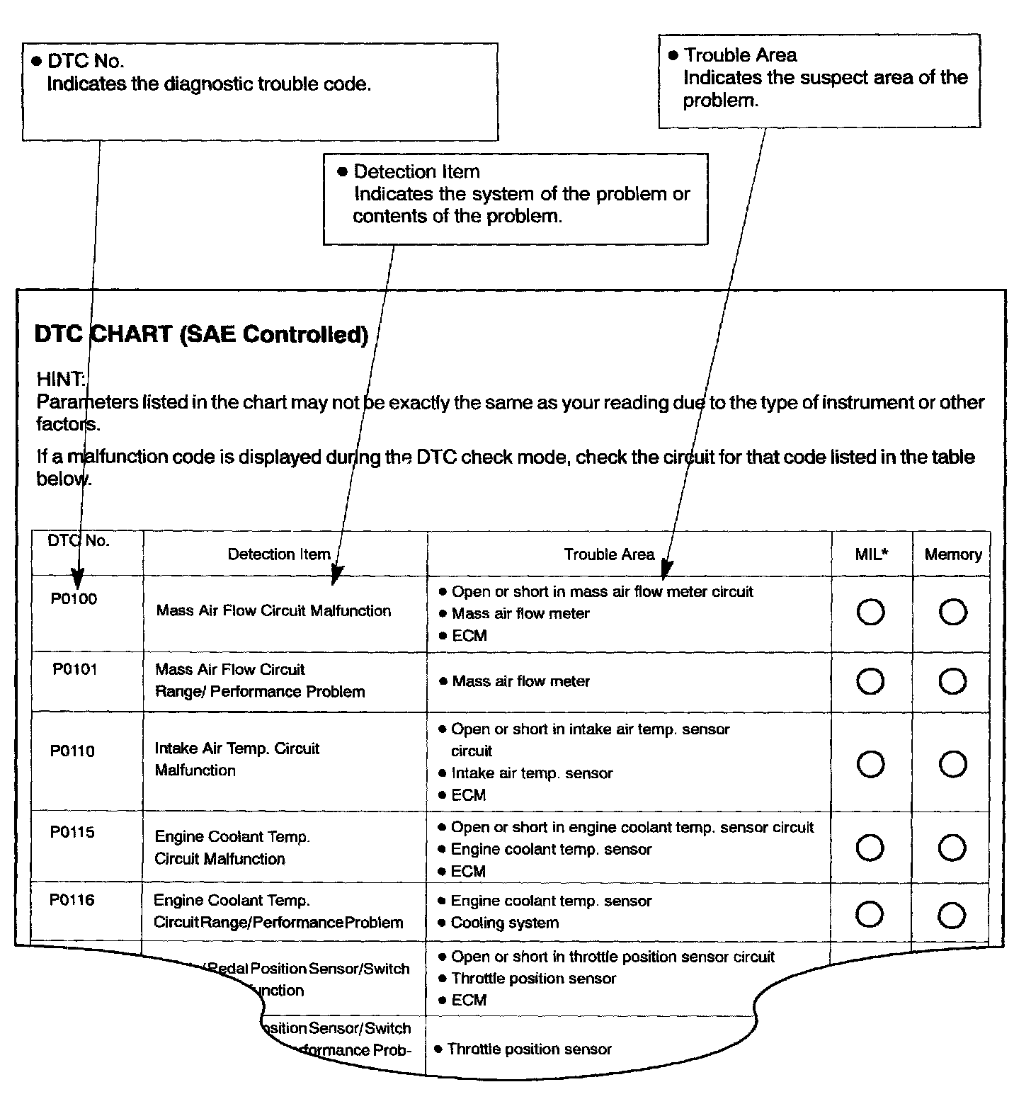 DIAGNOSTIC TROUBLE CODE CHARTThe inspection procedure is shown in the table. This table permits efficient and accurate troubleshooting using the diagnostic trouble codes displayed in the diagnostic trouble code check. Proceed with troubleshooting in accordance with the inspection procedure given in the diagnostic chart corresponding to the diagnostic trouble codes displayed. The engine diagnostic trouble code chart is shown as an example.