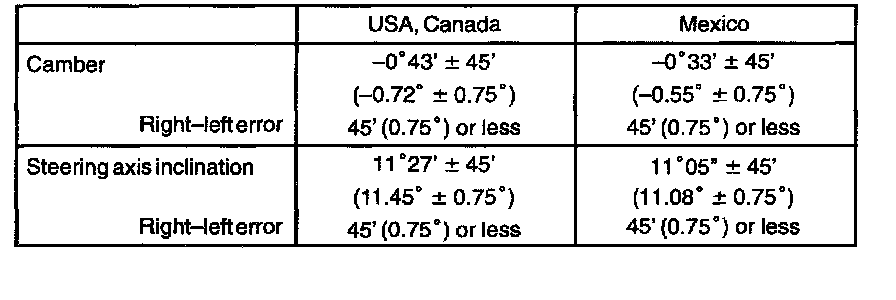 If the camber is not within the specified value, using the following table, estimate how much additional camber adjustment will be required, and select the camber adjusting bolt.