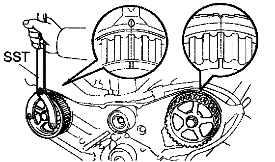 f. Using SST, turn the camshaft pulley, and align the timing marks of the timing pulley and No. 3 timing belt cover.