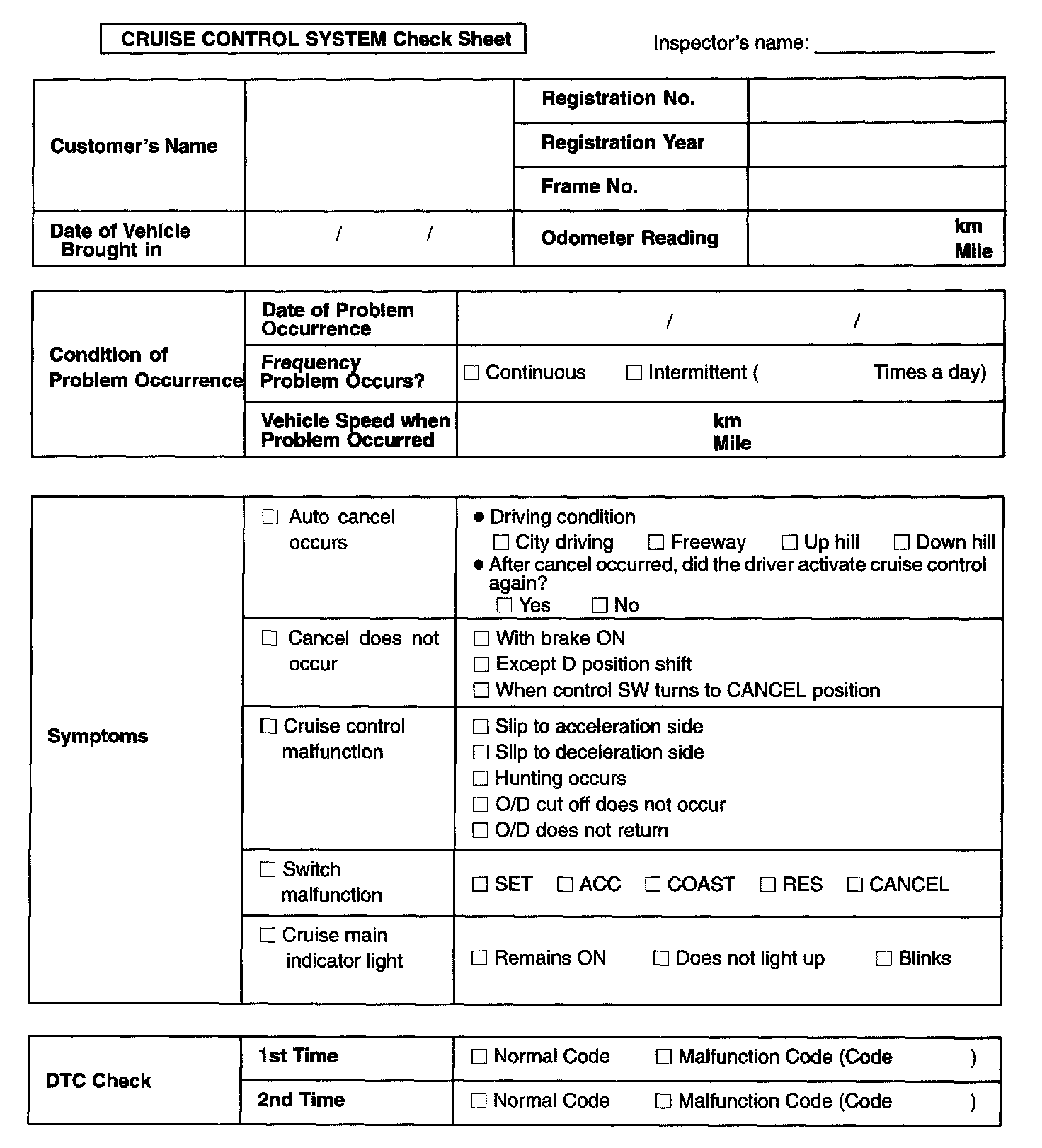 Cruise Control System Check Sheet: