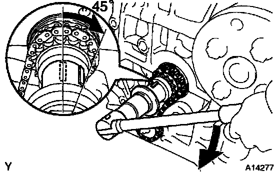 NOTICE: Under the condition with the timing chain cover removed, in case of rotating the camshafts, make the position of the crankshaft rotated clockwise by about 45° from TDC/compression of No. 1 cylinder.