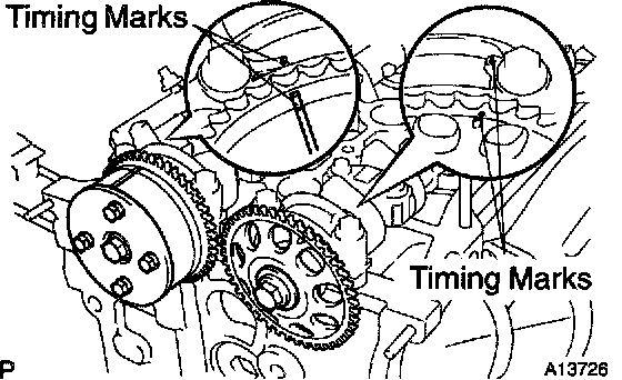 b. Check that the timing marks of the camshaft timing sprocket and VVT timing sprocket aligned with the timing marks of the No. 1 and No. 2 bearing caps as shown in the illustration.