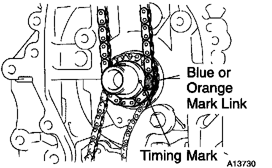 a. Install the timing chain on the crankshaft timing sprocket with the blue or orange mark link aligned with the timing mark on the crankshaft timing sprocket.
