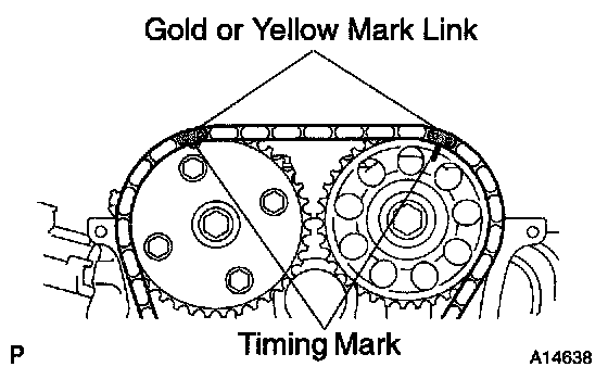 b. Install the timing chain on the camshaft timing sprocket and VVT timing sprocket with the gold or yellow mark links aligned with the timing marks on the camshaft timing sprocket and VVT timing sprocket.