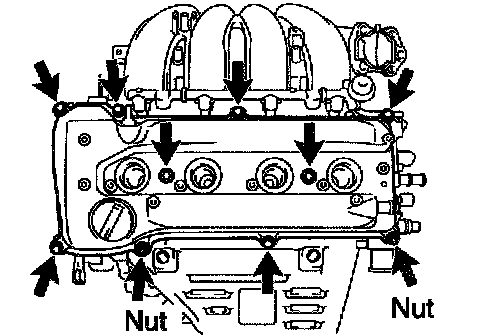 d. Remove the 8 bolts, 2 nuts, cylinder head cover and gasket.